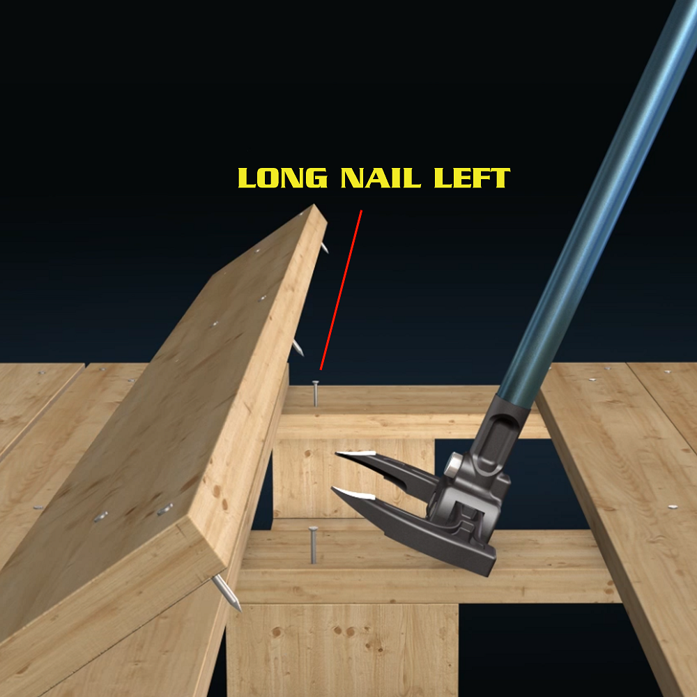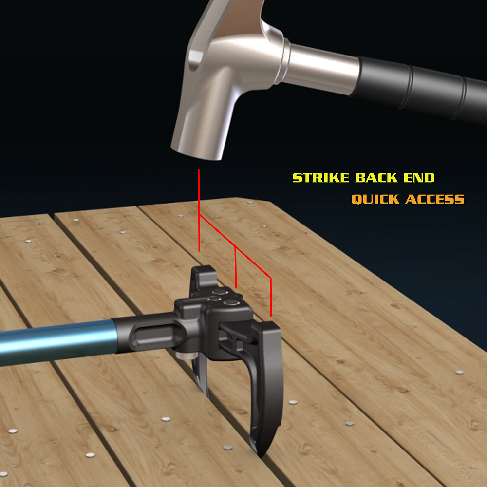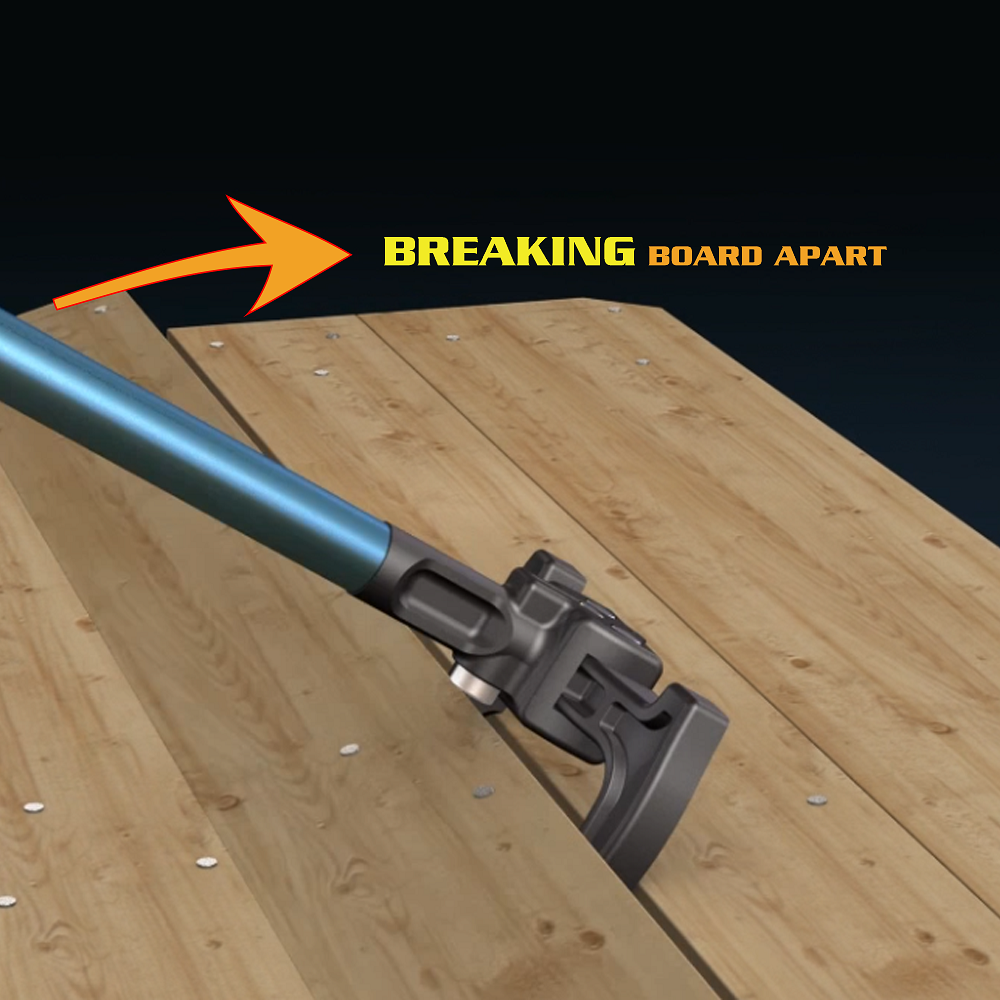 Dual Claw Pry Bar head design provides balanced lift on both sides of the boards and so that they can be removed faster and easier